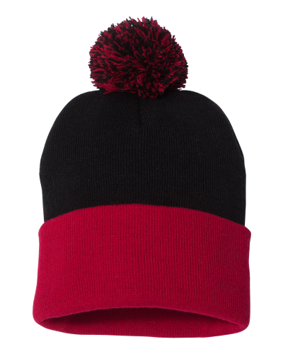 100% acrylic. Heather Grey is 62/38 acrylic/ polyester. Heather Charcoal is 80/20 polyester/ acrylic. Other Heather colors are 50/50 acrylic/ polyester. 12" knit, 4 Top-seams, 3'' cuff, pom-pom on top.